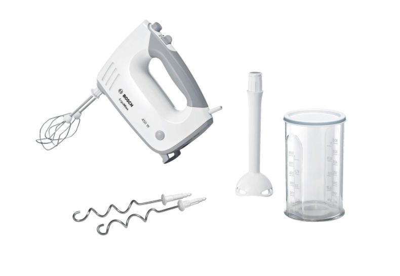4. Mixer de mana Bosch MFQ36440, 450 W, 5 viteze + Turbo, Pasator, Vas gradat, Alb/Gri.