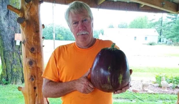 Americanul spune că dimensiunea vinetei sale record se datorează fertilizării cu gunoi de grajd de vacă și de oaie și alte câteva lucruri pe care le ţine secrete.