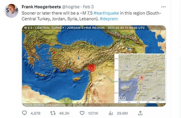 În data de 3 februarie 2023, Frank Hoogerbeets scria pe Twitter: "Mai devreme sau mai târziu, va avea loc un cutremur cu magnitudine de aproximativ 7,5 în această regiune (Turcia central-sudică, Iordania, Siria, Liban)".