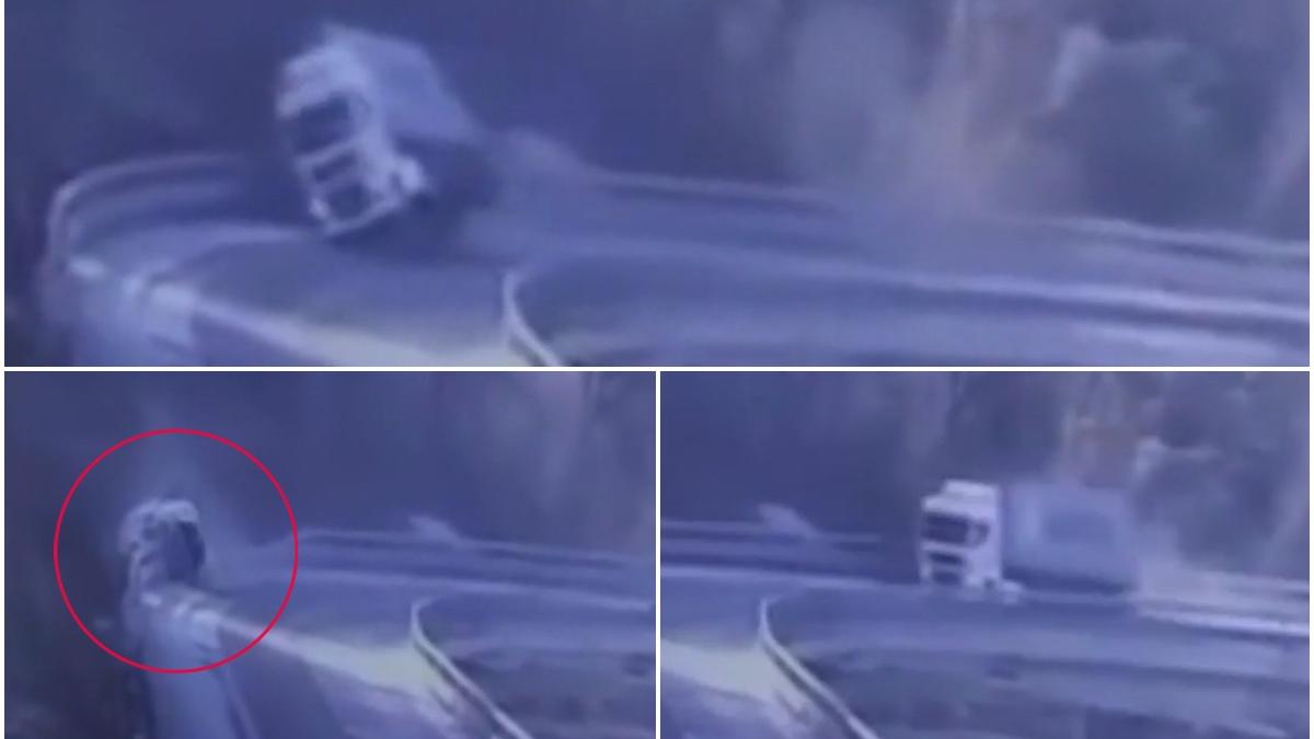 Accidentul a avut loc pe o autostradă din Italia. O cameră de bord a surprins momentul în care camionul intră cu viteză în curbă, se dezechilibrează și plonjează în râpă.