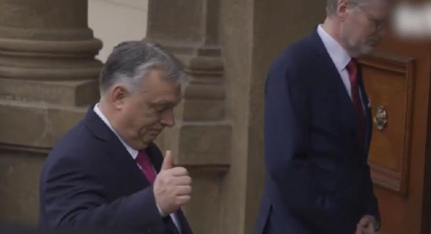 Orban nu s-a pierdut cu firea și a ridicat degetul mare de la mâna dreaptă, într-un gest ironic-aprobator, după cum se vede în imaginile difuzate de Antena 3 CNN.