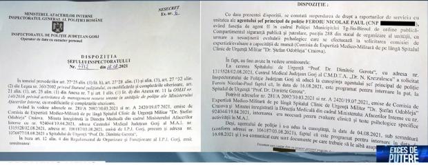 "Această dispoziţie a venit la două zile de la data la care domnul Feroiu ar fi trebuit să se interneze la pat, la Psihiatrie, la Spitalul Ministerului de Interne Gerota. A fost anunţat că i-a fost suspendat contractul de muncă încheiat între el şi IPJ Gorj. Domnia sa, în ultima vreme era poliţist la Ordine Publică, la Poliţia Municipiului Târgu-Jiu, iar în această hârtie pe care a primit-o de la IPJ Gorj, sunt invocate mai multe articole din lege, printre care şi statutul poliţistului. Ori, consultând statutul poliţistului, am observat că nicăieri nu se face vorbire despre o internare la Psihiatrie, ci despre un consult psihoogic", a precizat Carmina.