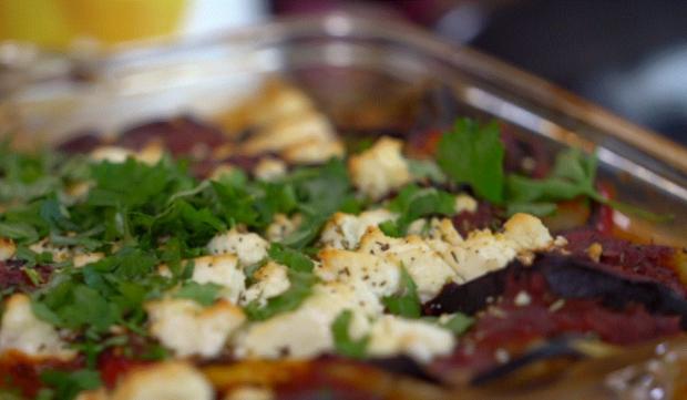 Legumele se vor tăia rondele. Pentru a scurta timpul de coacere, cartofii se pot prefierbe. După ce legumele se aranjează unele după celelalte, se poate adăuga şi roşia şi sosul de roşii.