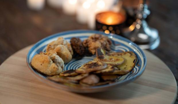 Reţetă de chiftele cu cartofi tăiaţi felii şi copţi pe plită cu sare grunjoasă