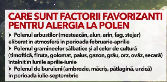 "Putem să nu ne expunem în mod gratuit atunci când ne aflăm într-un mediu în care există o concentrație mare de polen, adică în zile foarte uscate eventual cu vânt și deloc neglijabil, atunci când există furtuni cu descărcări electrice, existând pericolul unor crize astmatice care pot duce persoanele în camerele de urgență și toate regulile de bun simț - purtarea unor pălăriii, a ochelarilor de soare, păstrarea hainelor cu care au venit de afară la intrare în încăperi și totdeauna să studiem calendarul polenurilor atât în țară, cât și atunci când ne deplasăm în străinătate pentru că putem să ne păcălim în țară să fie o concentrație mai mică și acolo unde ne ducem să ne stricăm vacanța".