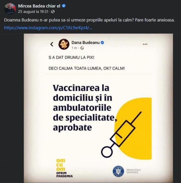 ”A fost jihad la mine pe Facebook! Au fost tone de reproșuri! Am mai șters din ei cu ocazia asta. Eu nu am același adevăr ca al ei. Am alt adevăr! Dânsa e în tabăra cu ideea că vaccinul este horror, non stop. Eu nu zic așa. Sunt pe persoană fizică”, a subliniat Mircea Badea.