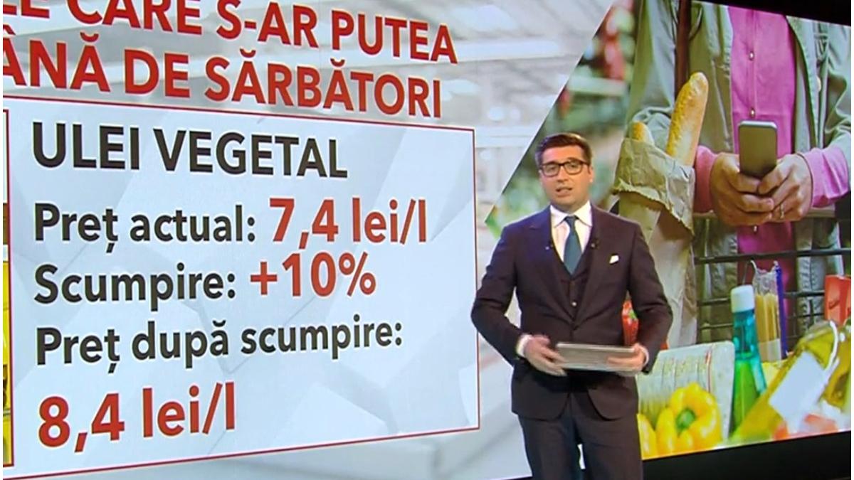 Apoi, uleiul, produsul care s-a scumpit cel mai mult în ultimul an, nu se opreşte şi până la final de 2021 se aşteaptă scumpiri de 10%. Aşa că, dacă azi plătim 7 lei şi 40 de bani pe un litru de ulei, la final de decembrie am putea să-l cumpărăm cu peste 8 lei.
