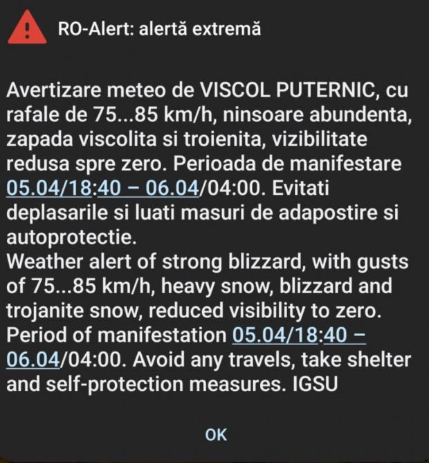Oamenii au primit, în această seară, un mesaj de ”alertă extremă” din partea RO-ALERT, după ce meteorologii au anunțat cod roşu de viscol și ninsoare. Evitați deplasările și luați măsuri de adăpostire și autoprotecție!