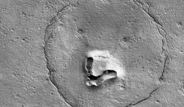 "Există un deal cu o structură de colaps în formă de V (nasul), două cratere (ochii) și un model de fractură circulară (capul)”, se arată în declarația de pe site-ul NASA.