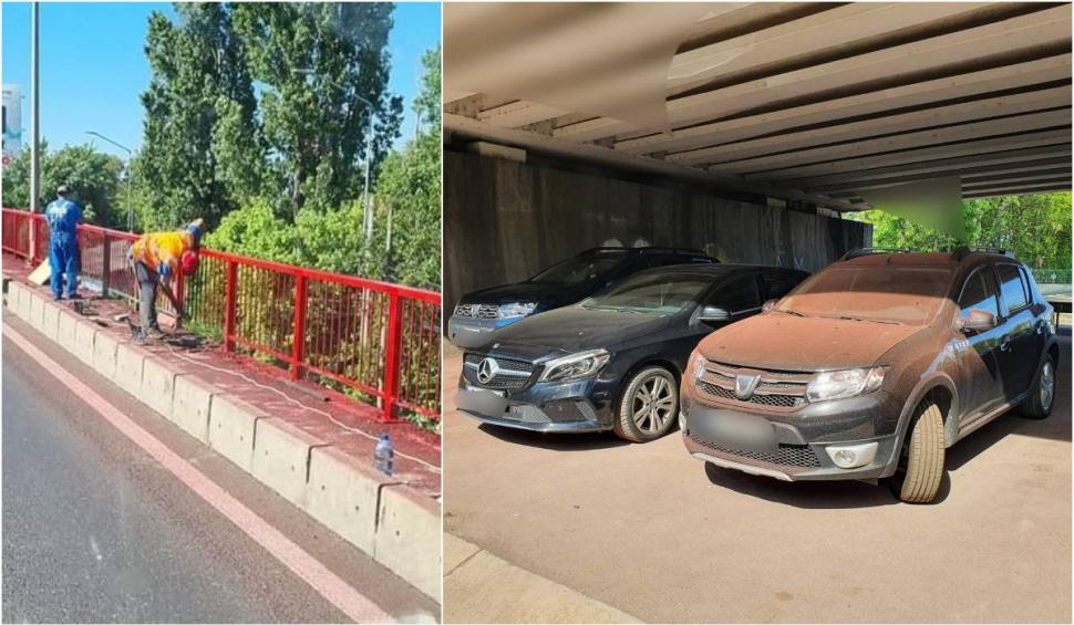 În neatenția, sau poate nepăsarea lor, au vopsit și mașinile care se aflau sub pod.