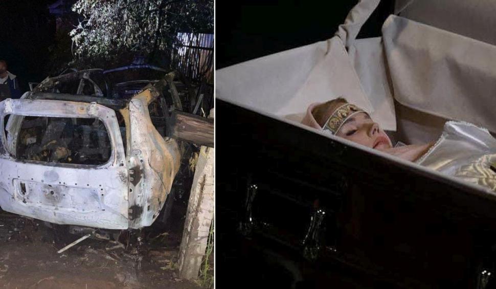 Foto: mașina distrusă de explozia care a ucis-o pe fiica lui Aleksandr Dughin (stânga) și Daria Dughina, în sicriul cu capacul deschis, la ceremonia funerară de marți, de la Moscova (drepta)