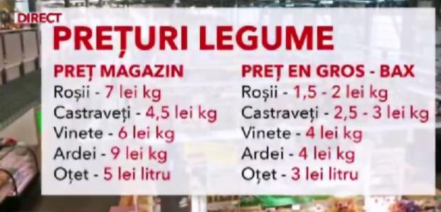 Când vine vorba despre cămara de iarnă, cumpărăturile en-gros ne pot ajuta să economisim serios. Baxurile de 10 kilograme se vând mai ieftin decât în piețe. Astfel că roșiile ajung la 2 lei/kg, castraveții la 3 lei iar în ceea ce priveşte ardeii și vinetele 4 lei- kg. Oțetul, pe care de asemenea îl găsim aici, este și el 3 lei pe litru la bax.