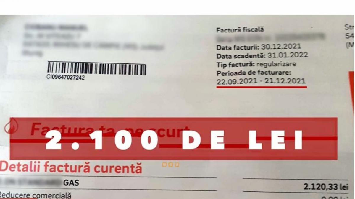 2.100 de lei. Atât are de plătit o familie din judeţul Mureş factura la gaze. Preţ de aproape 20 de ori mai mare faţă de lunile anterioare, penultima factură fiind de 180 de lei. Explicaţia furnizorilor: o regularizare pe ultimele trei luni.