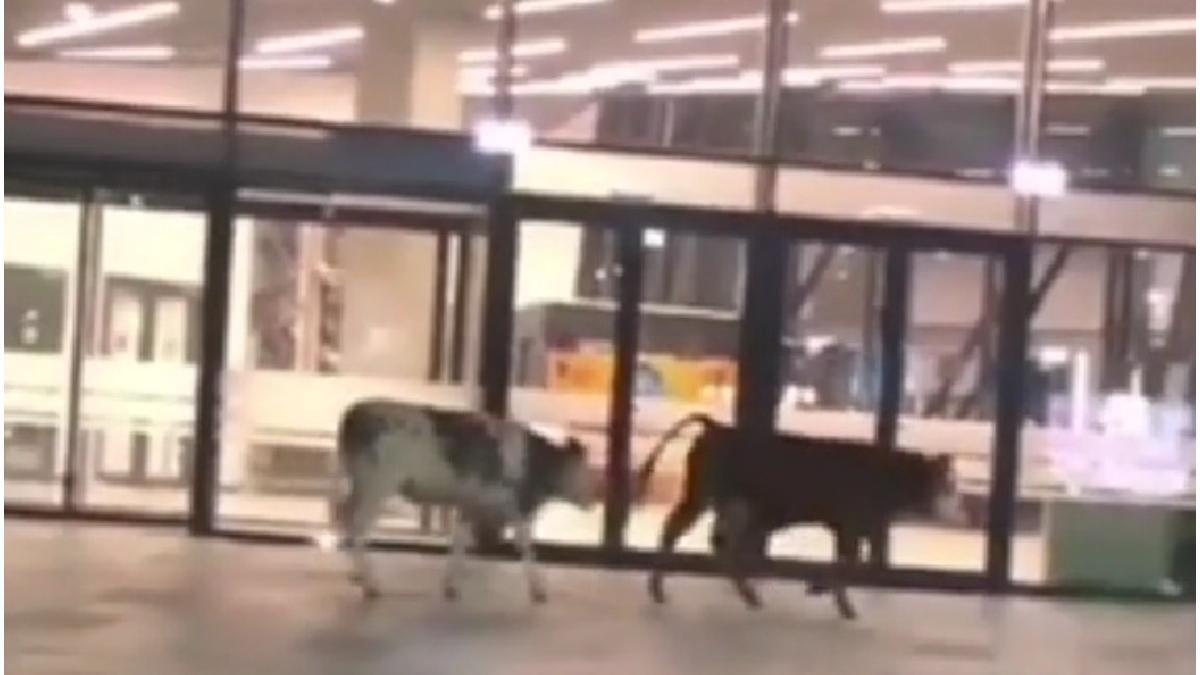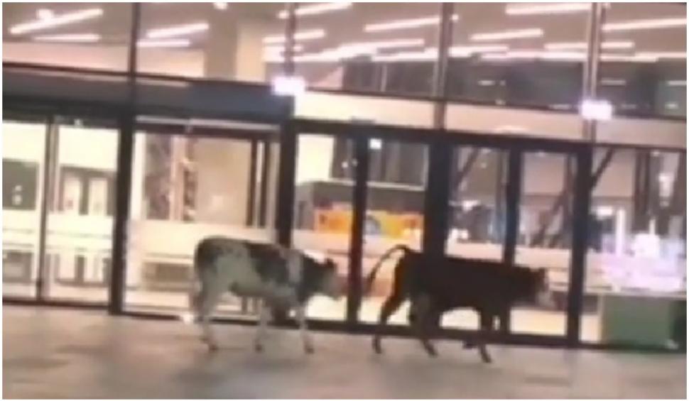 Doua vaci se plimba nestingherite prin parcarea aeroportului, la usa terminalului de sosiri internaționale, in apropierea pistei.