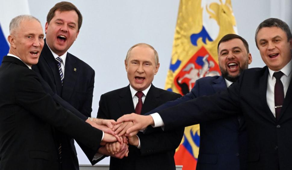 În cadrul ceremoniei, liderul de la Kremlin a semnat documentele de anexare ale celor patru regiuni din Ucraina, alături de Evgheni Baliţki, liderul din Zaporojie, de omologul său din Herson, Vladimir Saldo, precum şi de preşedinţii autoproclamatelor republici Doneţk şi Lugansk, Denis Puşilin şi Leonid Pasecinik.