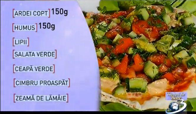 Cum vă sună lipie cu humus, ardei copţi, avocado, roşie si castravete, toate aromate cu cimbru şi mărar proaspat?