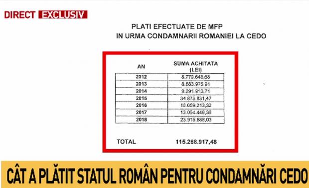 Potrivit Finanțelor Publice, cuantumul total al despăgubirilor plătite în urma condamnărilor României la Curtea Europeană a Drepturilor Omului pe perioada 2012-2018 a fost de 115.268.917,48 lei.