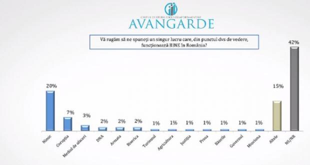 La întrebarea deschisă privind identificarea unui lucru care funcționează bine în România, 20% dintre cei intervievați au declarat că NIMIC nu funcționează în țara noastră.