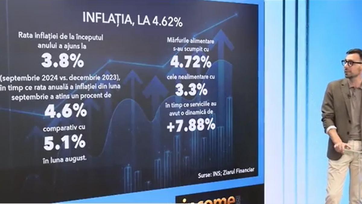 Dacă vă mai aduceți aminte, inflația era foarte mare în 2022, când depășise 16%, și deja conversațiile în familie și între colegi era că o să depășească 20-30%, că poate ajunge chiar la 100% și că o să fie exact ca în anii 1990. E bine, nu s-a întâmplat asta. Inflația scade, iar asta este marea știre a momentului. Ea scade de ceva timp, scade de aproape un an și vedem că este din ce în ce mai jos. Ultimele știri ne arată că inflația de la începutul anului este la 3,8%, iar dacă ne uităm la cifrele din septembrie, vedem că s-a ajuns la 4,6%.