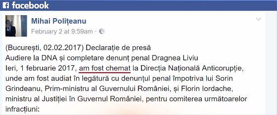 Mihai Polițeanu a scris pe Facebook că a fost chemat la DNA pe 1 februarie, în legătură cu denunțul împotriva lui Grindeanu și Iordache. Apoi, potrivit informațiilor prezentate la Antena 3, Polițeanu a fost chemat la DNA, pentru a face completări.