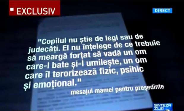 ”Copilul nu știe de legi. El nu înțelege de ce trebuie să meargă forțat să vadă un om care-l bate și-l umilește”, se arată în mesajul mamei pentru președintele Klaus Iohannis.
