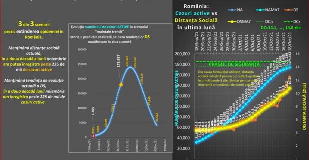 Potrivit raportului, trendul asccendent se menține până la jumătatea lunii noiembrie când sunt estimate 225.550 de cazuri active zilnice, dacă se menține distanța socială actuală.