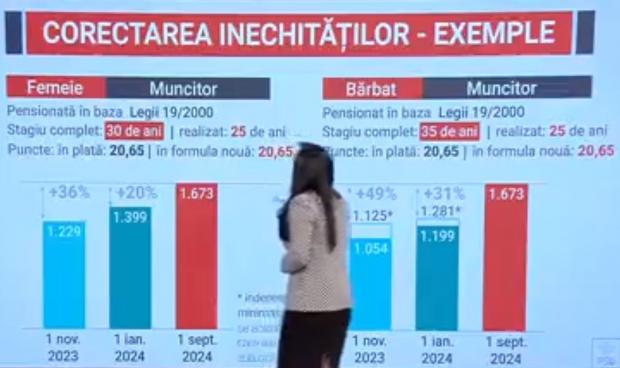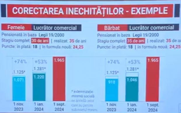 ”Avem o femeie, lucrător comercial, pensionată în baza legii 19/2000, cu un stagiu complet de 30 de ani, stagiu realizat de 35 de ani, cu puncte în plată 24,25. În acest moment, această doamnă se află în indemnizația minimă socială, cu 1125 de lei. Ca urmare a majorării de 13,8%, de la 1 ianuarie, va avea o creștere la 1281 de lei. Iar ca urmare a recalculării, constatăm că doamna în cauză va avea o pensie de la 1 septembrie 2024 în valoare de 1965 de lei. Ceea ce înseamnă că va avea o creștere de 74%”, a explicat Simona Bucura Oprescu la Antena 3 CNN.