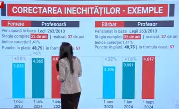 Și la profesori, diferențele de creșteri ale pensiilor sunt uriașe. În exemplul prezentat de Simona Bucura Oprescu la Antena 3 CNN, pensia unui profesor femeie va crește cu 20%, și va ajunge la 4617 lei, pe când pensia unui profesor bărbat va crește cu 32% și va ajunge tot la 4617 de lei.