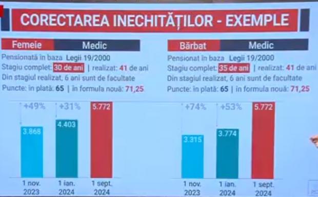 În același timp, pensia unui medic bărbat, cu un stagiu realizat de 41 de ani, va crește cu 74%, și va ajunge tot la 5772 de lei.