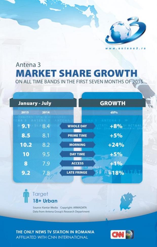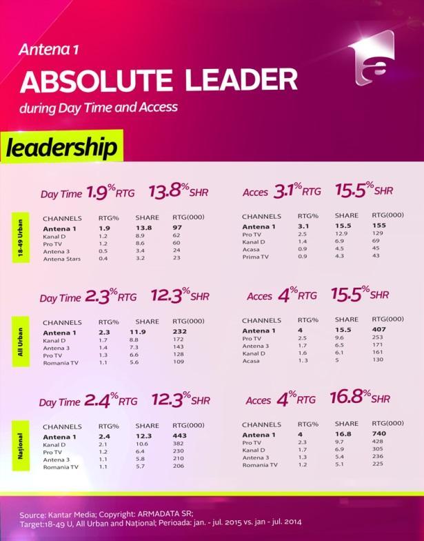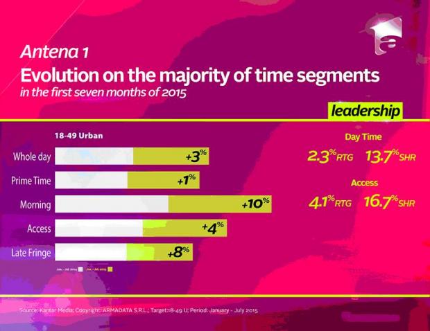 Intact Media Group’s TV channels show audience appreciation on all time segments, on the commercial target in the first seven months of 2015 and are audience leaders on key time intervals; Antena 1 leads during Whole Day, on the National target, in July, outclassing PRO TV, its main competitor.
