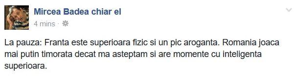 “La pauza: Franta este superioara fizic si este un pic aroganta. Romania joaca mai putin timorata decat ma asteptam si are momente cu inteligenta superioara”, scrie Mircea Badea, pe Facebook.