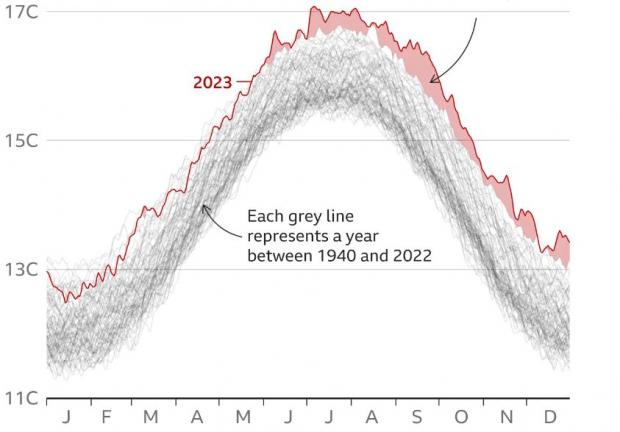 Un grafic publicat de BBC arată temperatura medie zilnică a aerului la nivel global.