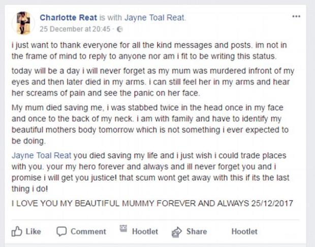"Ziua de astăzi va fi o zi pe care nu o voi putea uita niciodată fiindcă mama mea a fost ucisă chiar în fața mea și a murit ulterior în brațele mele. Încă o pot simți în brațele mele și o aud cum țipa de durere și pot vedea panica de pe chipul ei. Mama mea a murit salvându-ma pe mine, am fost înjunghiată de două ori în cap, o dată în față și o dată în spatele gâtului. Sunt cu familia și mâine va trebui să merg să-mi identific frumoasa mamă, un lucru pe care nu mi-am imaginat că voi fi vreodată nevoită să îl fac", a povestit tânăra pe Facebook.