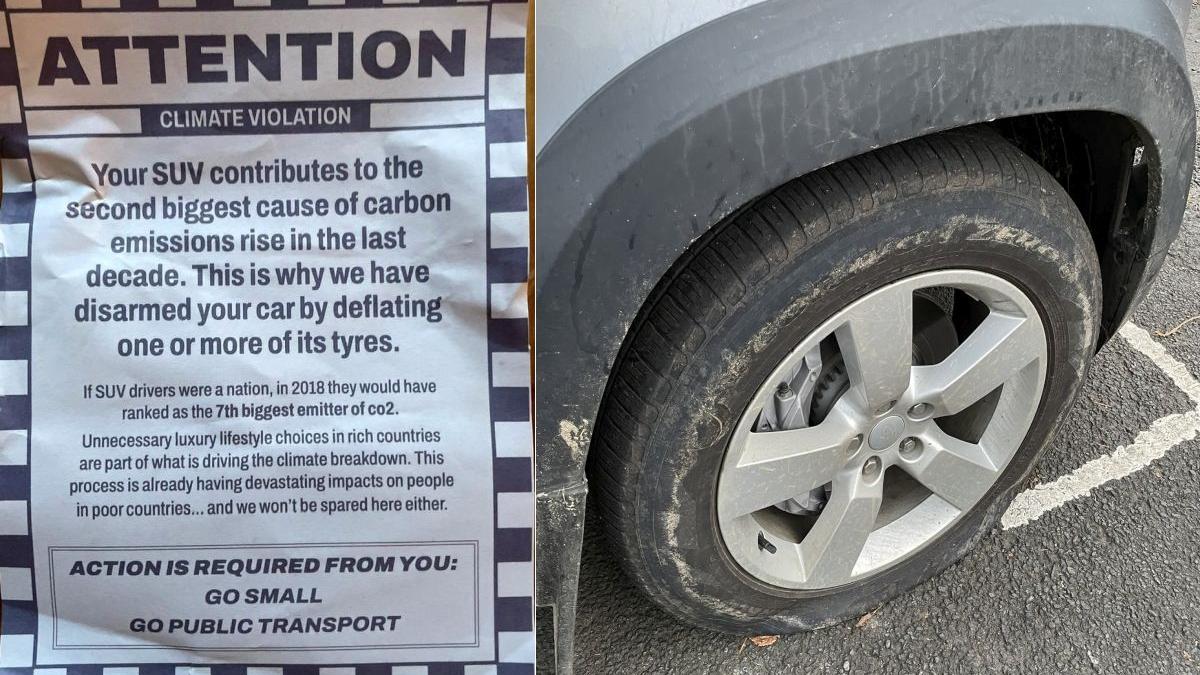 Mai multe SUV-uri parcate în oraș s-au ales, pe lângă roțile pe jantă, cu fluturași care le stigmatizau drept "crime climatice".