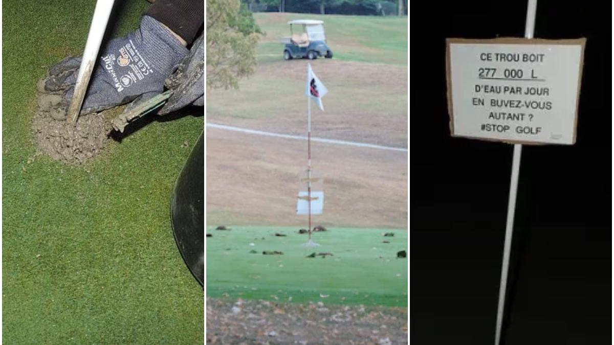Extinction Rebellion Toulouse a postat pe Twitter o fotografie care aparent arată o gaură de golf umplută cu ciment și o pancartă pe care scrie: "Această gaură consumă 277.000 de litri. Tu bei atât de mult? #Stop Golf".