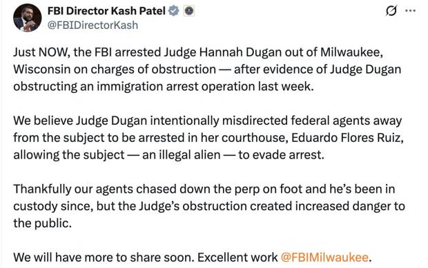 „Credem că judecătoarea Dugan i-a îndrumat greșit în mod intenționat pe agenții federali departe de persoana care urma să fie arestată în tribunalul ei. Asta a permis lui Eduardo Flores Ruiz - un străin ilegal în SUA - să se sustragă arestării. Din fericire, agenții noștri au urmărit infractorul și acesta a fost arestat, însă obstrucția judecătoarei a creat un pericol sporit pentru public”, se putea citi în postarea lui Patel, înainte ca aceasta să fie ștearsă rapid.