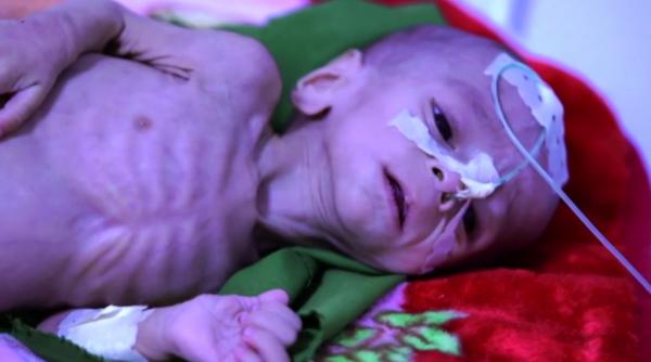 "Asta face foametea celor mai fragile vieți", se aude comentariul reporterului, care însoțește defilarea imaginilor unor copii de șase, respectiv trei luni, cărora li se văd coastele.