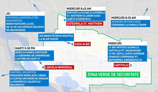 "Sunt garduri cu sârmă ghimpată peste tot, sunt foarte mulţi militari şi poliţişti. Străzile sunt închise şi, de la distanţă, se poate vedea doar acoperişul Capitoliului. Dincolo de tensiunea pe care o simţim pe străzile pustii din Washington, astăzi este o atmosferă mai relaxată. Oamenii au început să iasă din case. Poartă măşti. Spun că nu se aşteptau ca oraşul să se transforme într-o bază militară, dar vor urmări la televizor ceremonia de învestire a preşedintelui Joe Biden", a spus Camelia Ureche despre atmosfera din capitala Americii.