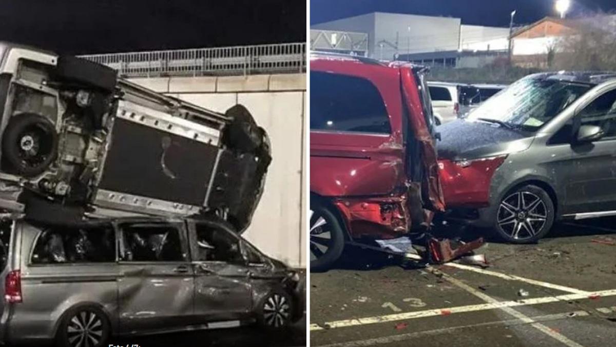 A luat dubiţe pe sus şi le-a răsturnat peste alte modele de lux marca Marcedes, apoi, cu toată puterea utilajului a împins rânduri întregi de maşini unele în altele.