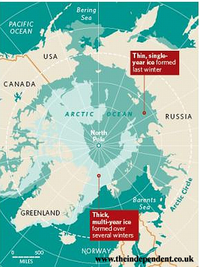 În fiecare vară, gheaţa de la suprafaţa apei se topeşte şi se formează apoi în timpul lungii ierni arctice. Anul trecut s-a înregistrat însă o pierdere masivă de gheaţă, mare parte din Oceanul Arctic devenind lichid. Calota de gheaţă se întinde în prezent numai până la aproximativ 1200 de kilometri de Polul Nord.