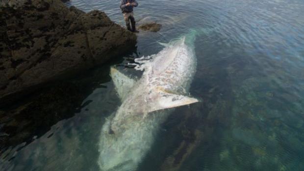 Cadavrul unui rechin de dimensiuni uriașe a fost fotografiat în apropierea unei plaje din Cornwall, Marea Britanie.