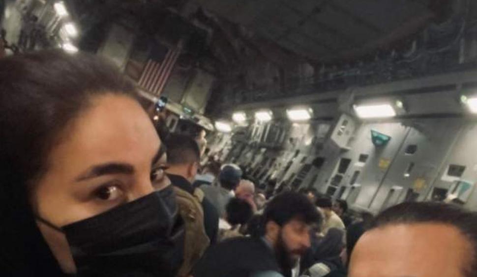 Ea a distribuit pe rețelele sociale o fotografie care o înfățișează în cala unui avion militar american, înconjurată de alți civili evacuați.