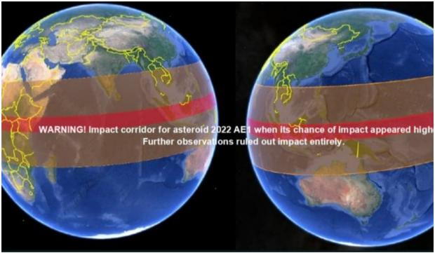 Stația Spațială Europeană a publicat și o imagine cu zonele de pe Terra care ar fi putut fi afectate de coliziune: ”incertitudinile inițiale ale orbitei asteroidului 2022 AE1 au însemnat că se afla pe un coridor de risc extins pe Pământ. Când asteroidul de 70 de metri părea că ne va lovi (un scenariu acum exclus complet), posibilul impact ar fi avut loc asupra multor regiuni locuite de pe Pământ. Regiunea roșie formează nucleul celor mai probabile puncte de impact, benzile portocalii din jur arată zone care au fost mai puțin probabile, dar nu au putut fi excluse”, transmite Agenția Spațială Europeană.