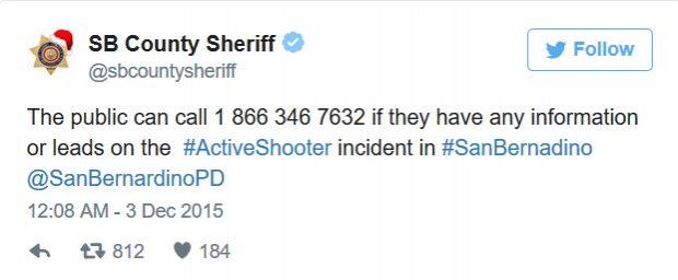 — San Bernardino Fire (@SBCityFire) December 2, 2015 California: Active shooter in San Bernardino - east of Los Angeles. 20 victims. https://t.co/k269SqMMxi #7News https://t.co/kTTxU73I48