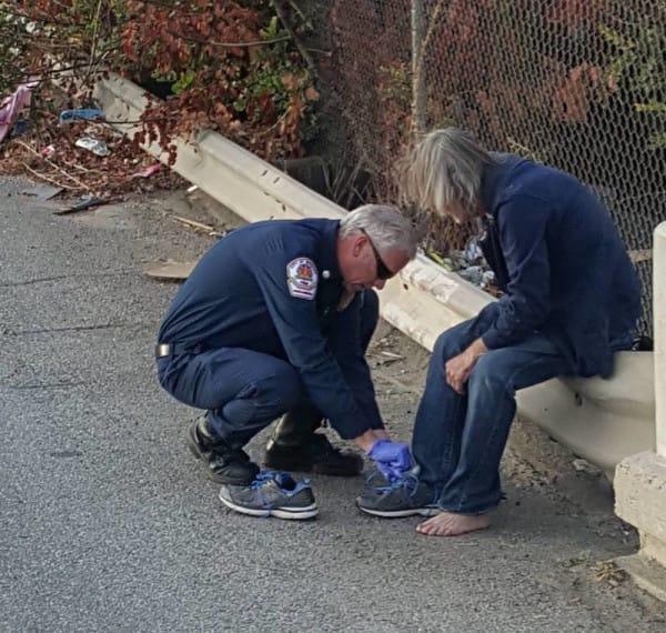 Unul dintre pompieri, David Gilstrap, și-a dat jos pantofii și i-a dat omului fără adăpost.