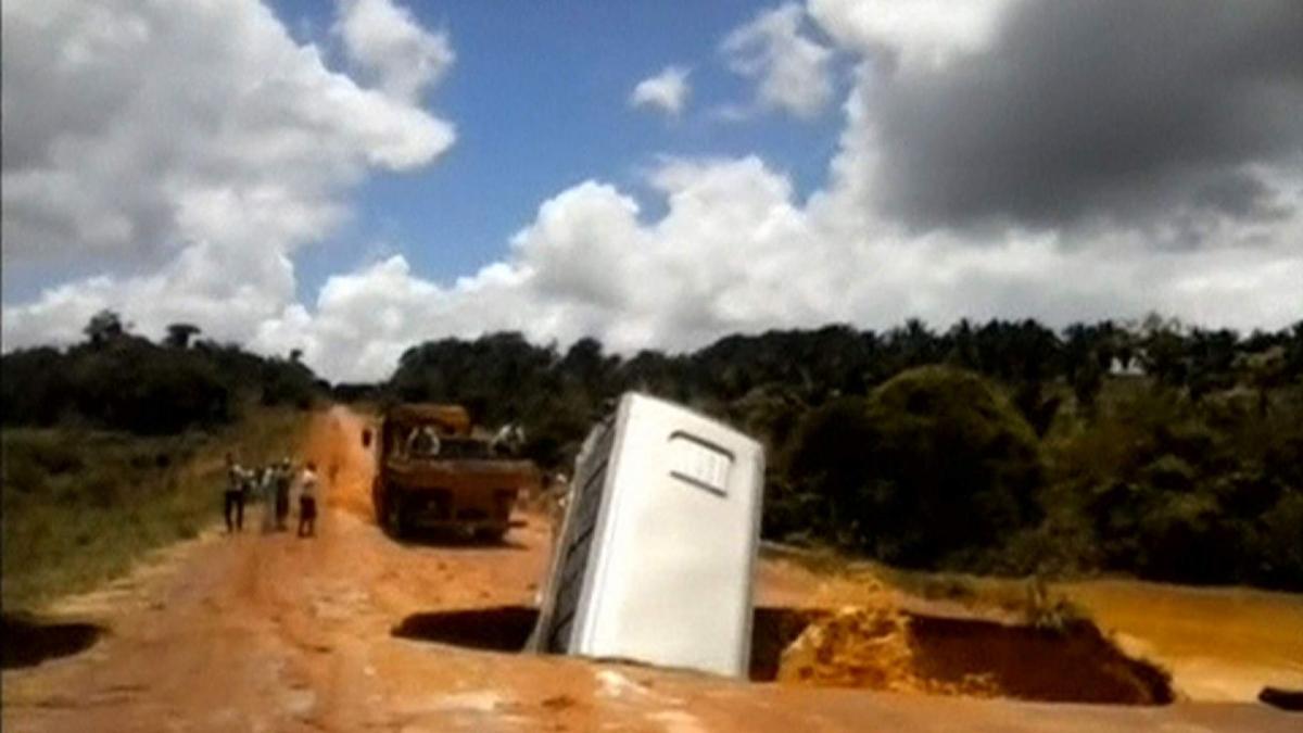 Pe imagini se observă cum autobuzul se prăbuşeşte în craterul format şi este luat de un şuvoi de apă abundent, care săpase şi îşi făcuse loc pe sub suprafaţa rutieră.