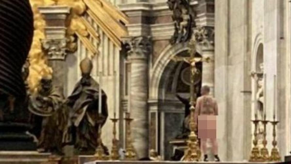 Protestatarul părea să aibă mesajul "Salvați copiii din Ucraina" scris pe spate. Paznicii Vaticanului l-au obligat să se îmbrace și să coboare de pe altar. Ulterior, el a fost predat poliției italiene.