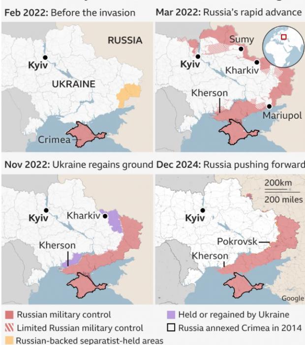 „Trebuie să spun că situația se schimbă dramatic. Sunt mișcări care au loc zilnic de-a lungul întregii linii a frontului”, a declarat președintele Rusiei, Vladimir Putin, la conferința de presă de la sfârșitul anului din decembrie. În estul Ucrainei, mașina de război a Moscovei avansează kilometru cu kilometru în Donbas, cucerind orașe și sate, scrie BBC. Rusia câștigă teren mai repede decât oricând de când și-a lansat invazia la scară largă în februarie 2022, în ciuda atacurilor în număr record ale Kievului. Pe măsură ce invazia ajunge la sfârșitul celui de-al treilea an, la un cost estimat de un milion de oameni, uciși sau răniți, Ucraina pare să piardă.