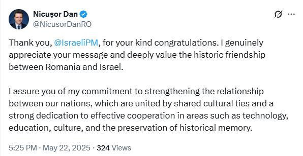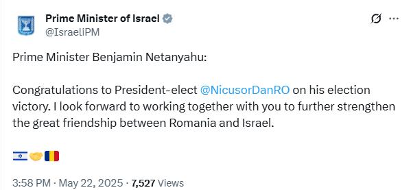 Felicitări președintelui ales Nicușor Dan pentru victoria sa în alegeri. Abia aștept să lucrăm împreună pentru a consolida și mai mult marea prietenie dintre România și Israel”, a transmis premierul israelian pe contul oficial de pe Twitter.