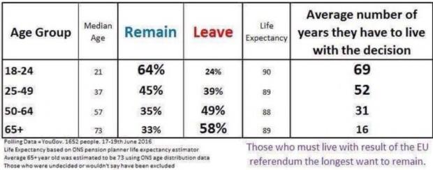 Astfel, 64 % dintre alegătorii cu vârste cuprinse între 18-24 de ani au votat în defavoarea Brexitului, în timp ce numai 24% și-au dorit ieșirea Marii Britanii din Uniunea Europeană. La polul opus, alegătorii cu vârste de peste 65 de ani au votat în proporție de 58% pentru ieșirea din UE.